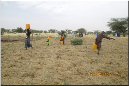 On voit des groupes de jeunes et d’adultes qui transportaient des bidons d’eau sur des charrettes puisés dans un marigot pour les verser dans les trous.